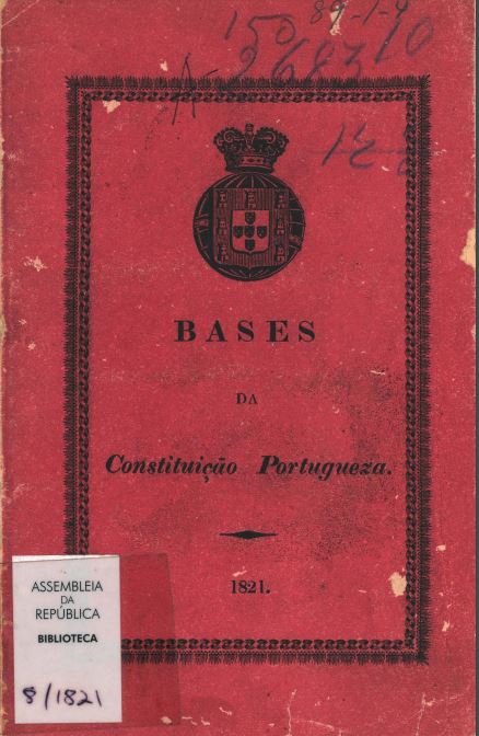Bases da constituição Portugueza aprovadas em sessão de Côrtes do dia 9 de Março e juradas no 29 do mesmo mez : dedicadas a S. M. F. o Senhor D. João VI rey do reino unido de Portugal, Brazil e Algarve. [S.l. : s.n.], 1821. 20 p. Cota: 8/1821