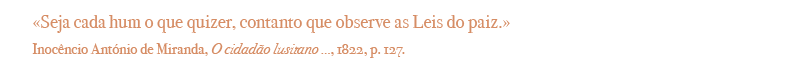 O Cidadão Lusitano : breve compendio, em que se demostrão os fructos da Constituição e os deveres do cidadão constitucional... / Innocencio Antonio de Miranda. Lisboa : na Typographia de M. P. de Lacerda, 1822. Cota: 295/1900 (5960)