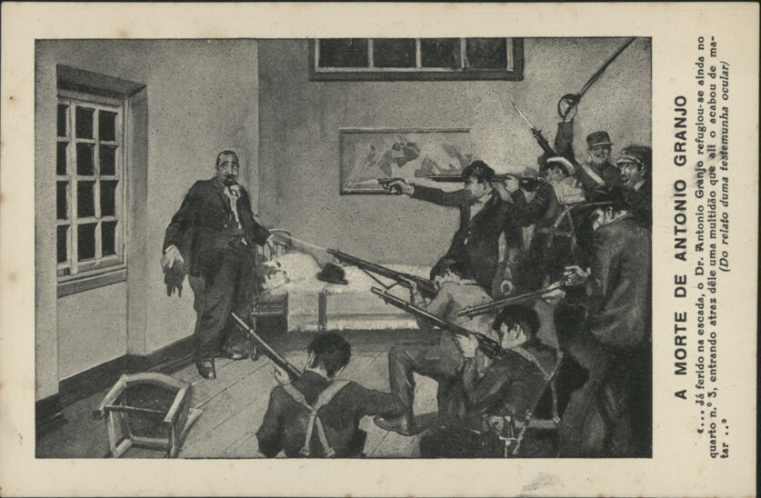 Soou uma descarga. (…) Granjo caiu ao comprido vertendo sangue por inúmeros ferimentos. Estava ainda nas últimas convulsões, quando um dos assassinos (…) sacou da espada e a cravou no estômago com violência tal que, atravessando o corpo, ficou presa ao sobrado.